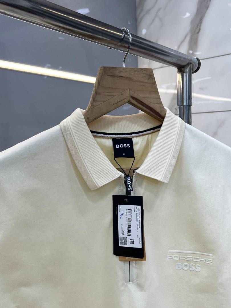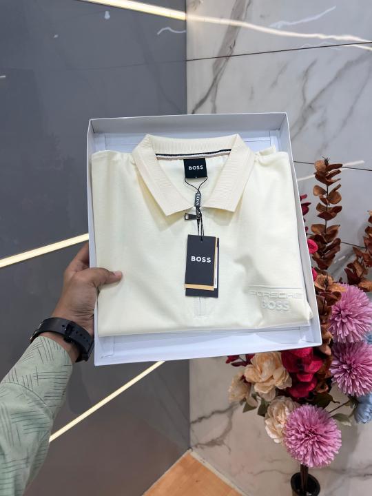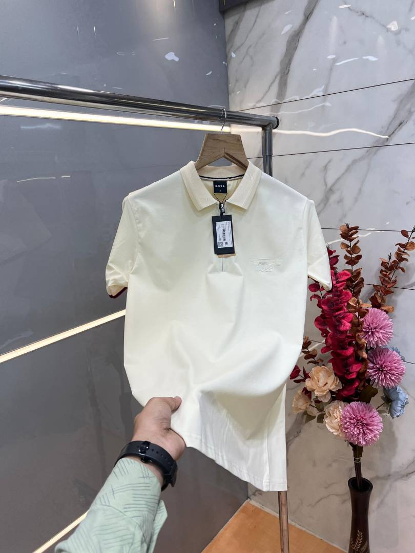 Hugo Bos s Cream Premium Imported 240 GSM Interlock Lycra Fabric Polo Tshirt with Emboss Logo and Brand Box Zip Style 3986